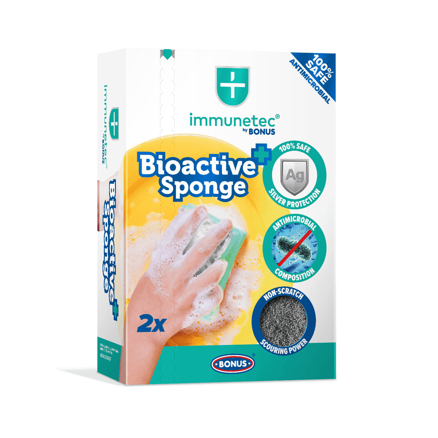 Baktérium, gomba és vírusmentes higiéné a takarítóeszközöd kémiai fertőtlenítése nélkül? Az Immunetec és BONUS közös fejlesztésével, az antimikrobiális Bioactive Sponge mosogatószivaccsal mindez valóra vált. Igazi különlegessége, hogy a gyártás során hozzáadott ezüst adalékanyagnak köszönhetően hatékonyan elpusztítja a szivacsba bejutó kórokozókat, melyet független laboratóriumi vizsgálatokkal is bizonyítottunk.