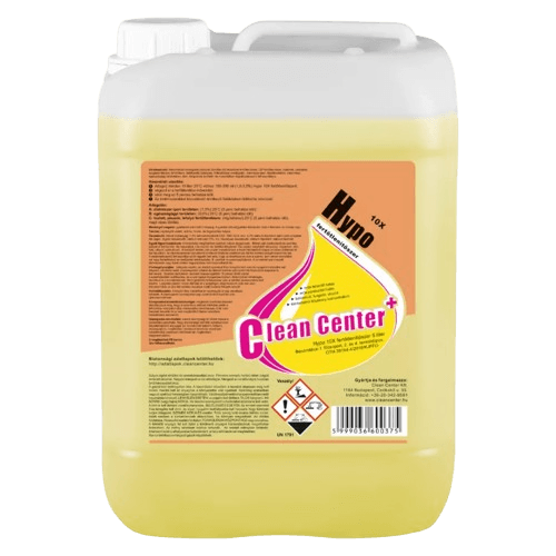 Termékleírás: Hypo 10X fertőtlenítőszer 5 liter – Professzionális tisztítószer különféle felületek tisztítására. Felhasználási területek: • általános felületek • intézményi takarítás • vendéglátóipari használat Hígítás és használat: A pontos hígítási arányt és felhasználási módot a termék címkéje és a biztonsági adatlap tartalmazza. Előnyök: • professzionális minőség • gazdaságos felhasználás • hatékony szennyeződés-eltávolítás • Clean Center rendszerben használható. Kiszerelés: lásd a termék megnevezésében és címkéjén feltüntetett űrtartalmat. Biztonsági információ: mindig tartsa be a biztonsági adatlap (SDS) és a címkén feltüntetett óvintézkedéseket, gyermekektől elzárva tartandó. Összetevők: a pontos összetételt és veszélyességi besorolást a Clean Center által kiadott hivatalos biztonsági adatlap tartalmazza.
