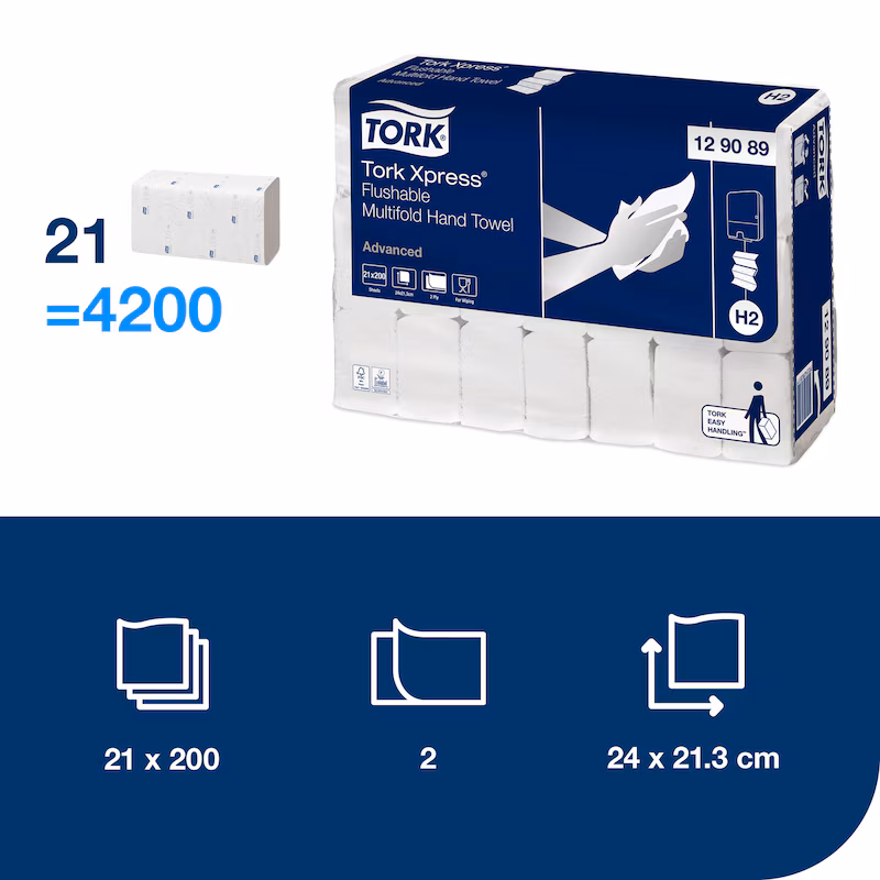A Tork Xpress® toalettbe dobható Multifold kéztörlők használatát olyan helyeken javasoljuk, ahol a kéztörlőket adott esetben a hulladékgyűjtő helyett a toalettbe lehet/kell bedobni. A kéztörlőket a Tork Xpress® Multifold kéztörlő adagolókba ajánljuk. A megbízható laponkénti adagolással csökken a fogyasztás, és ennek révén a keletkező hulladékmennyiség, ami kényelmet és higiéniát biztosít a mosdót használóknak.